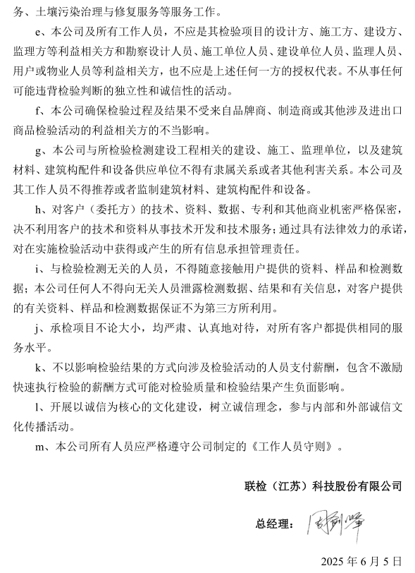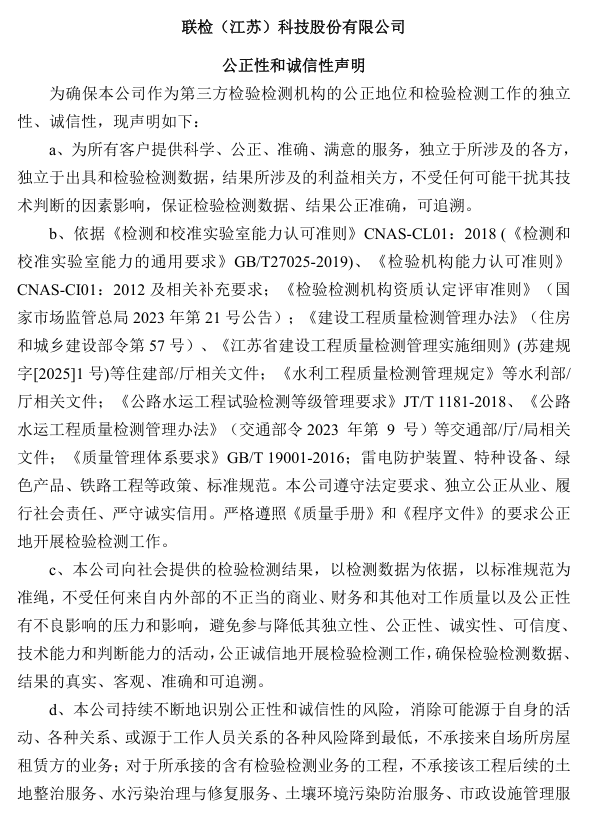 联检(江苏)科技股份有限公司公正性和诚信性声明